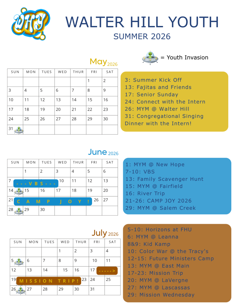 Tuesday, May 26th: MYM @ Walter Hill! We will need our teens to come at 6pm to help set up!