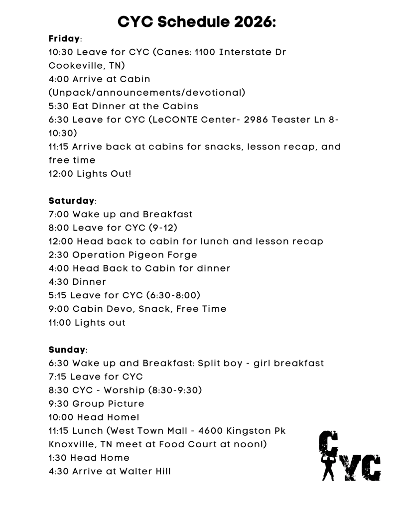 CYC stands for Challenge Youth Conference and is held February, 20-22. CYC is a teen favorite and always makes for great memories but most importantly lots of spiritual growth as we hear God’s Word presented in 4 powerful lessons. CYC will cost $100 for the weekend and payment will be due by January 31st. Students will also need money for three meals and a little shopping and activity money during “Operation Pigeon Forge,” which is where we allow students to ride go carts, visit the Island, or the Tanger Outlets during a free time on Saturday. As always there are scholarships available based on need. We don’t want anyone to be prevented from going because of the cost. We want everyone to attend CYC!