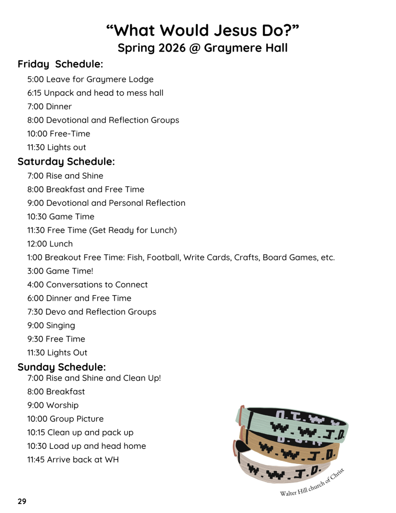 Fall Retreat – November 21-23 will be at Graymere Church of Christ lodge. Cost is $70 and chaperones go free! Our theme this year is “Arise: Seeking Growth in Christ” and we will focus on specific areas where we need to grow. This year we are doing sweatshirts instead of t-shirts. Sweatshirt sizes must be turned in by October 21st.